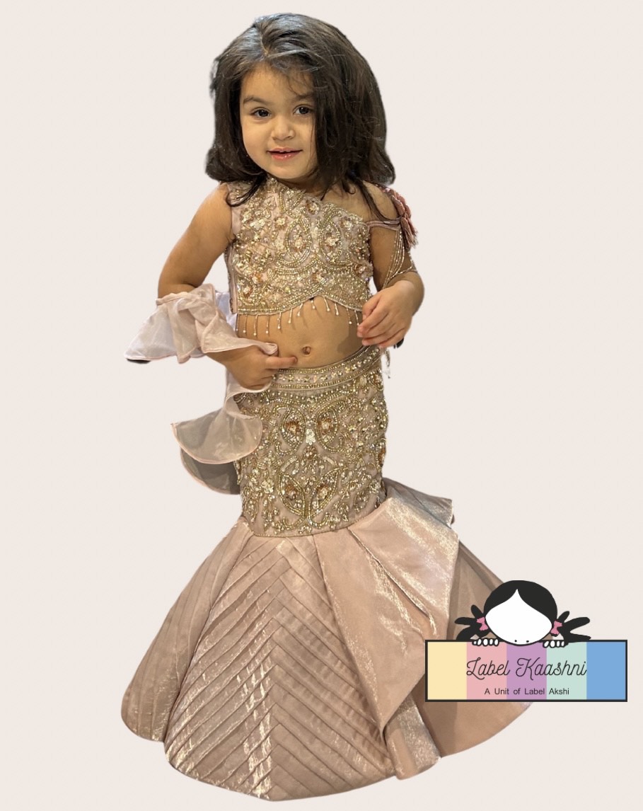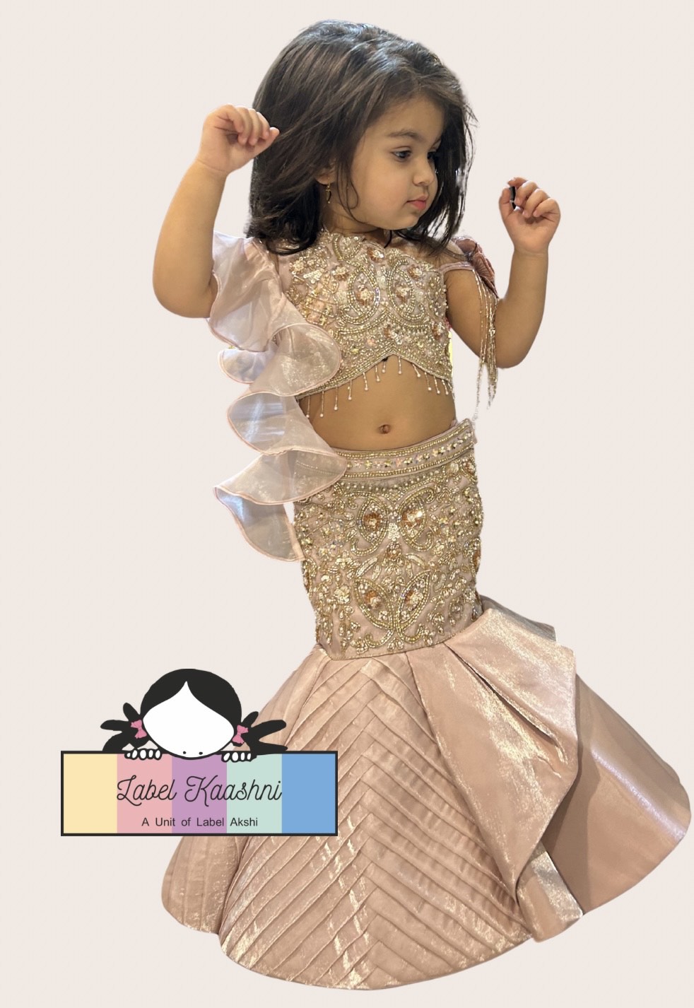 The silhouette is fitted from the hips, perfectly sculpting the body before flaring into a stunning ruffled and pleated bottom skirt, giving it that signature mermaid finish. Complementing the outfit is a ruffle dupatta that adds volume, drama, and movement.